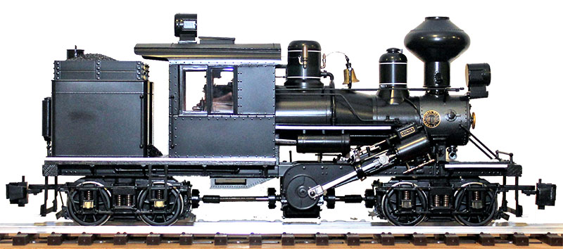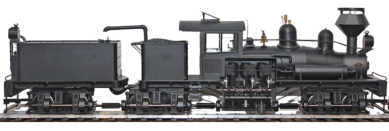 The Shay locomotive had three vertical cylinders on the engineer's (right) side, with the boiler offset to the left. The crankshaft drove both axles on two or three trucks through bevel gears. Here is a photo of my Bachmann F scale 3-truck Shay.